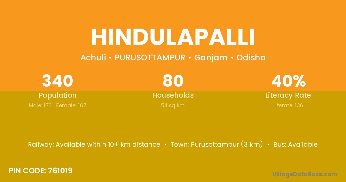 Purusottampur (3 km) is the nearest town to Hindulapalli village for major economic activities and is located approximately 3 km away.