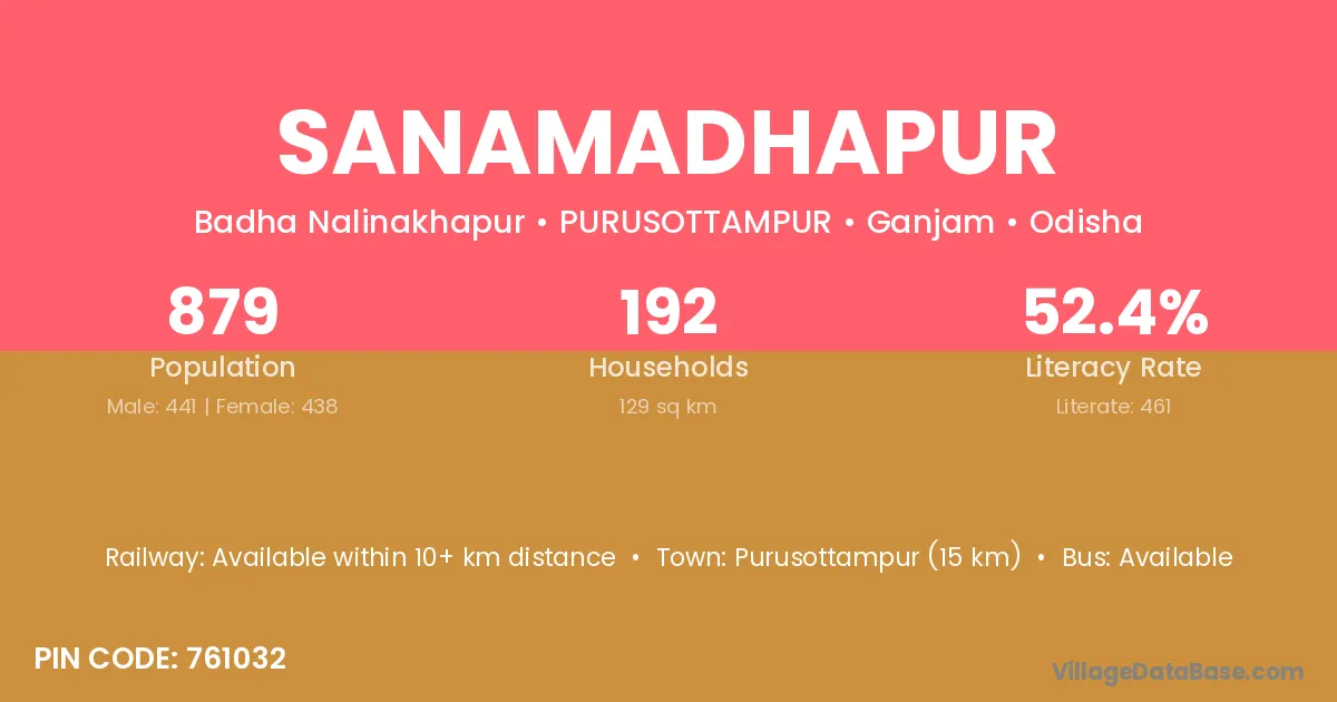 Sanamadhapur village has a total population of 879 people, of which 441 are males and 438 are females.