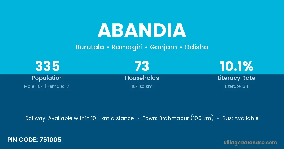 Brahmapur (106 km) is the nearest town to Abandia village for major economic activities and is located approximately 106 km away.