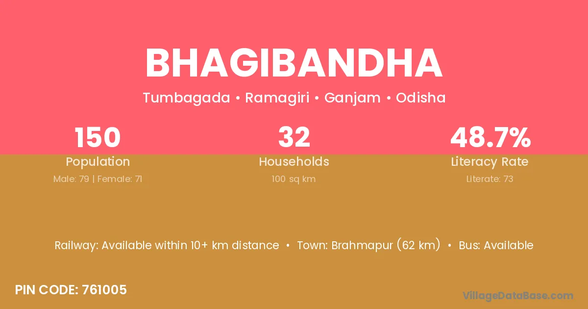 Brahmapur (62 km) is the nearest town to Bhagibandha village for major economic activities and is located approximately 62 km away.