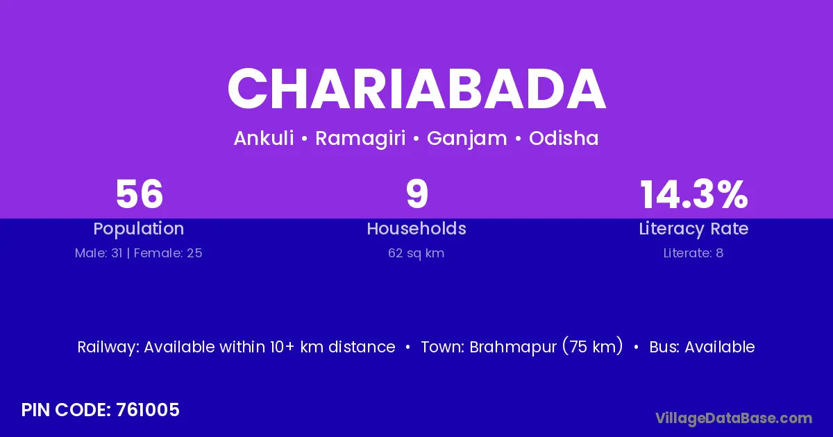 Brahmapur (75 km) is the nearest town to Chariabada village for major economic activities and is located approximately 75 km away.