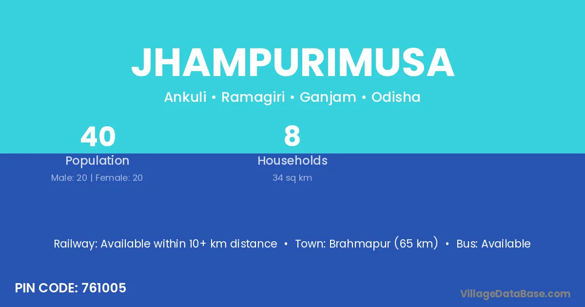 Brahmapur (65 km) is the nearest town to Jhampurimusa village for major economic activities and is located approximately 65 km away.