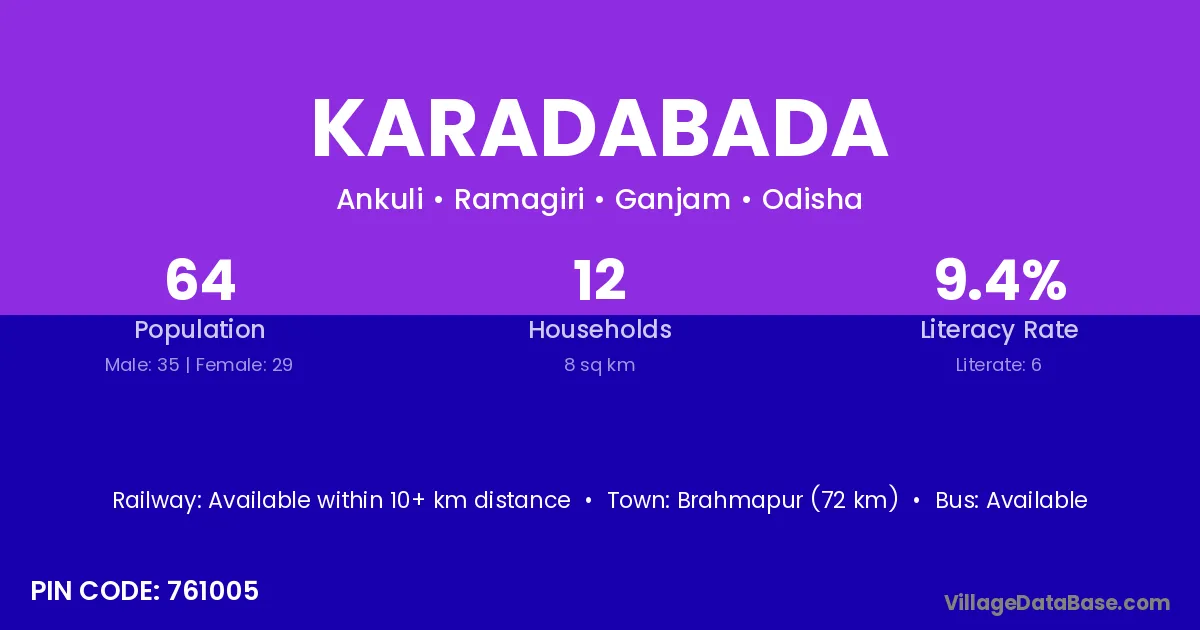 Brahmapur (72 km) is the nearest town to Karadabada village for major economic activities and is located approximately 72 km away.