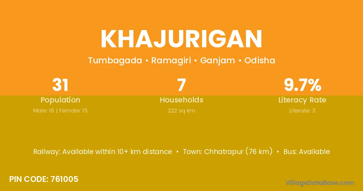 Chhatrapur (76 km) is the nearest town to Khajurigan village for major economic activities and is located approximately 76 km away.