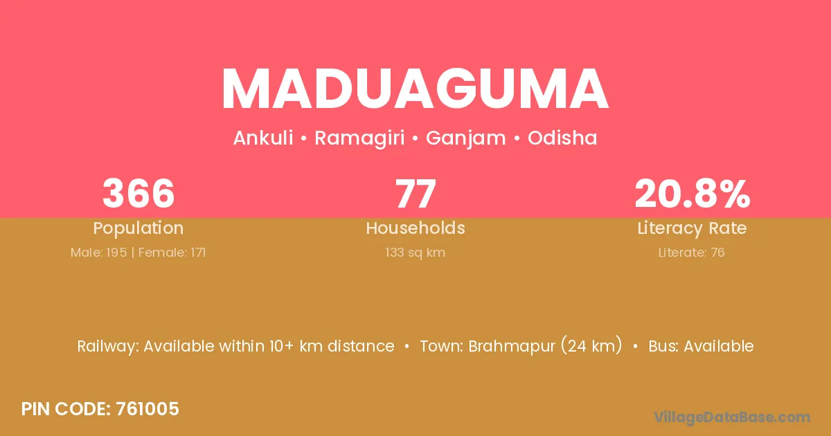 Brahmapur (24 km) is the nearest town to Maduaguma village for major economic activities and is located approximately 24 km away.