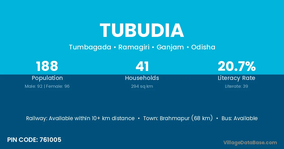 Brahmapur (68 km) is the nearest town to Tubudia village for major economic activities and is located approximately 68 km away.