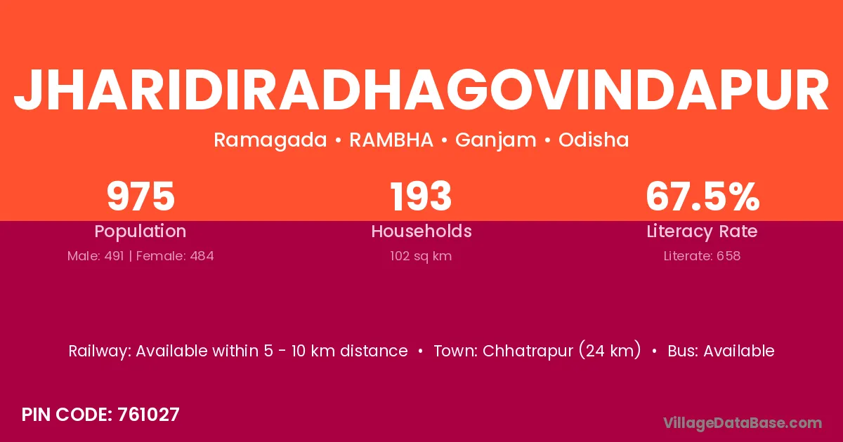 Chhatrapur (24 km) is the nearest town to Jharidiradhagovindapur village for major economic activities and is located approximately 24 km away.