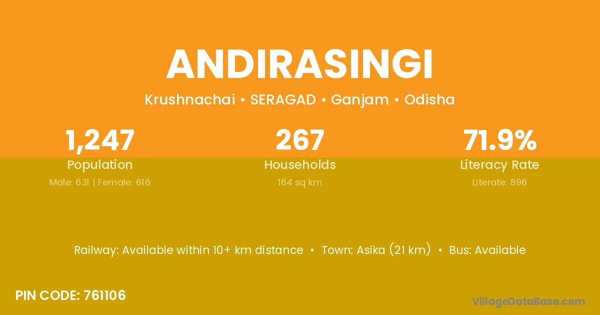 Asika (21 km) is the nearest town to Andirasingi village for major economic activities and is located approximately 21 km away.