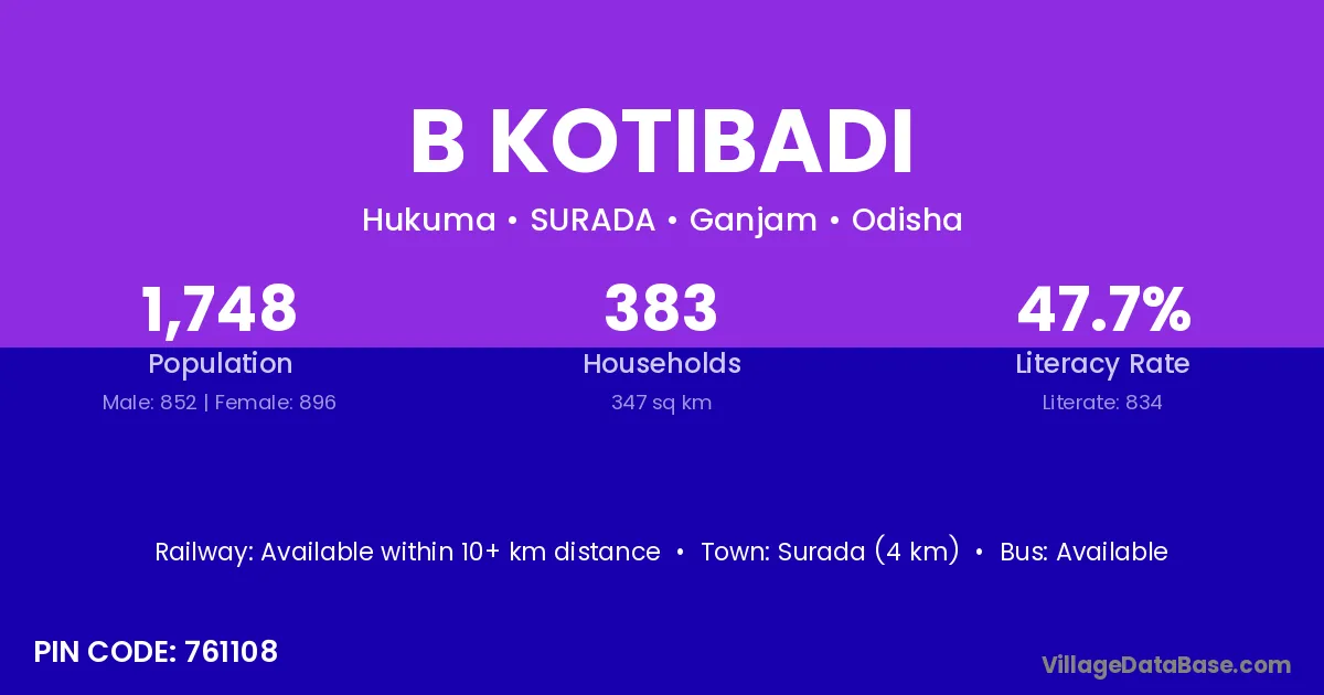 Surada (4 km) is the nearest town to B Kotibadi village for major economic activities and is located approximately 4 km away.
