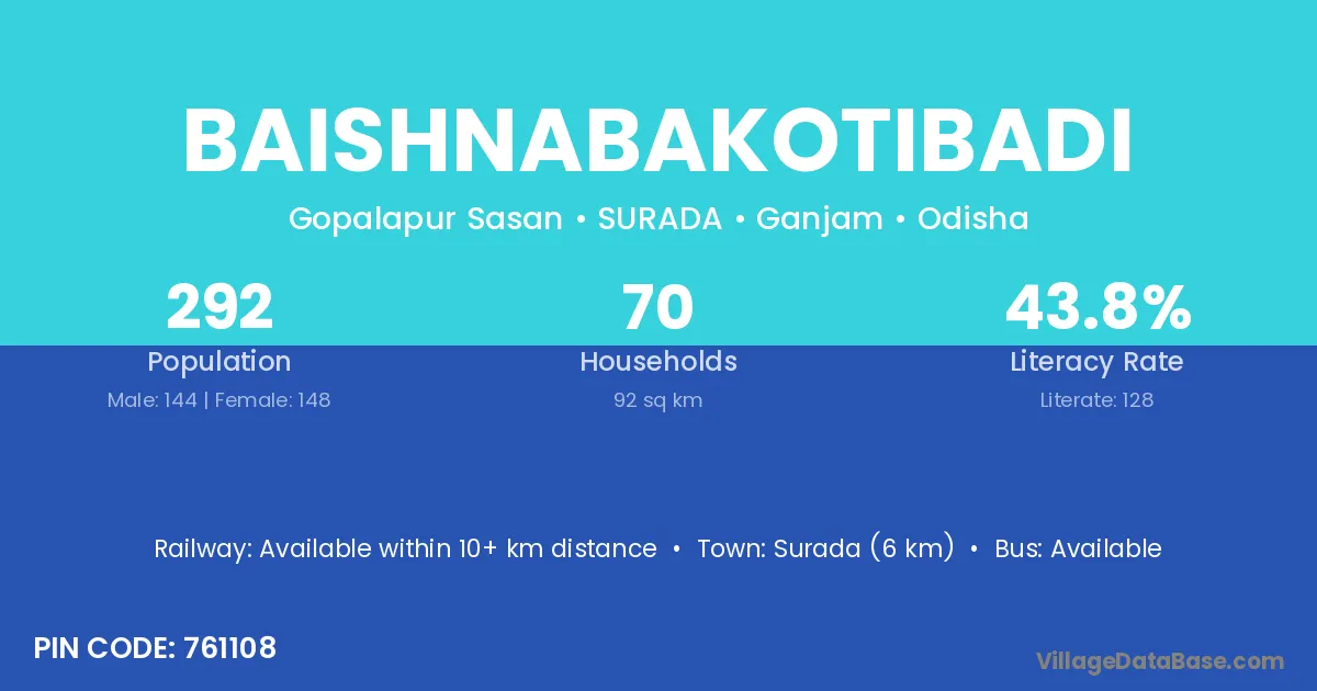 Surada (6 km) is the nearest town to Baishnabakotibadi village for major economic activities and is located approximately 6 km away.