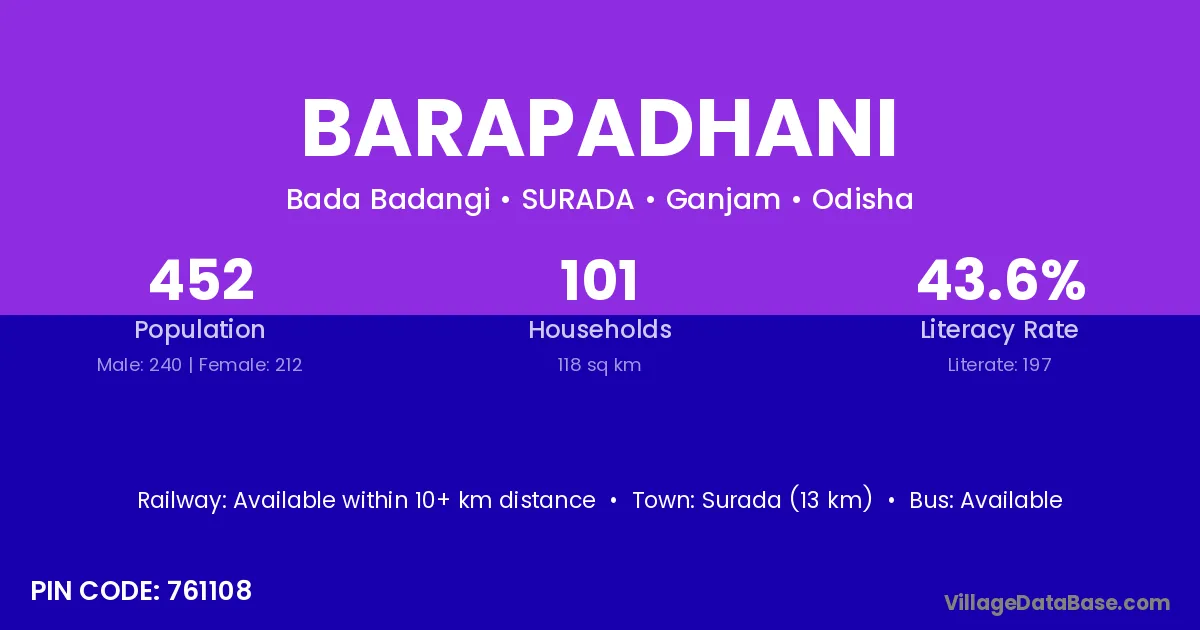 Surada (13 km) is the nearest town to Barapadhani village for major economic activities and is located approximately 13 km away.