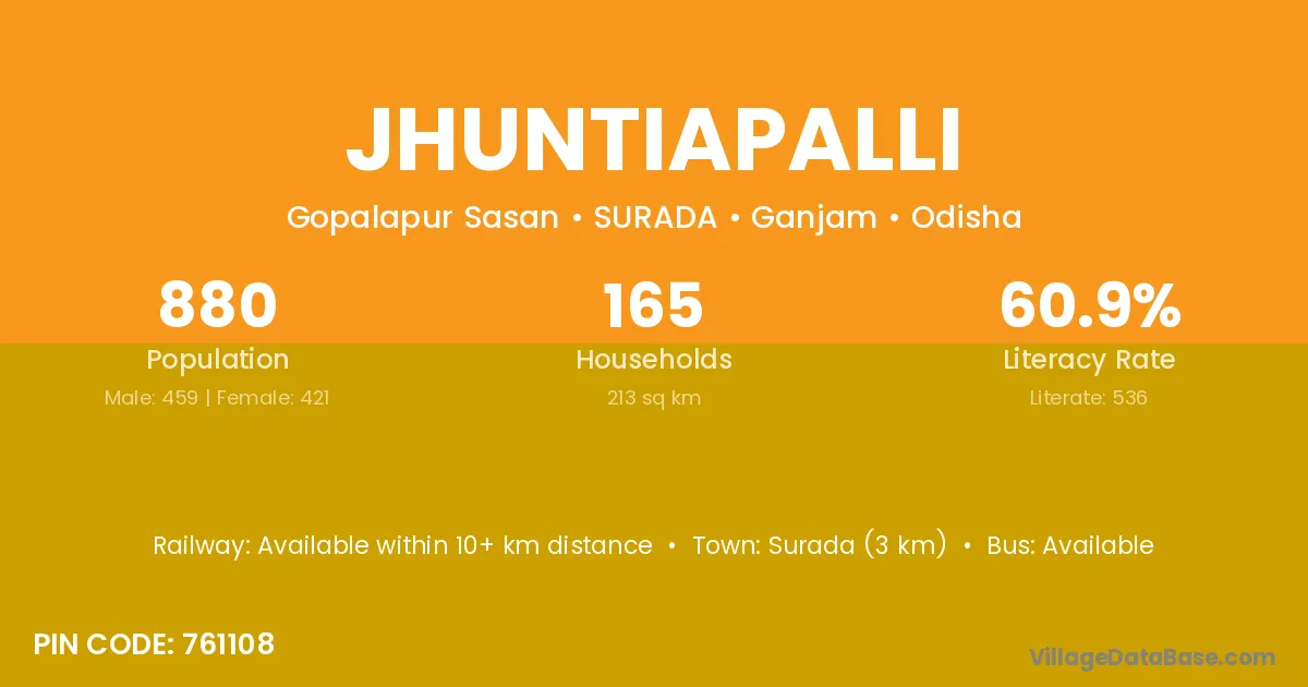 Surada (3 km) is the nearest town to Jhuntiapalli village for major economic activities and is located approximately 3 km away.