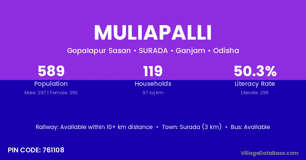 Muliapalli village is located in the SURADA Tehsil of the Ganjam district in Odisha .