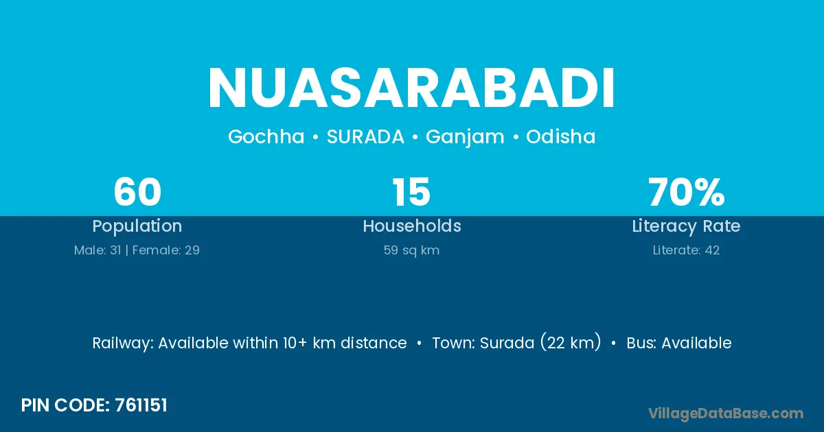 Surada (22 km) is the nearest town to Nuasarabadi village for major economic activities and is located approximately 22 km away.