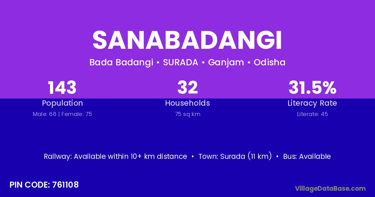 Surada (11 km) is the nearest town to Sanabadangi village for major economic activities and is located approximately 11 km away.
