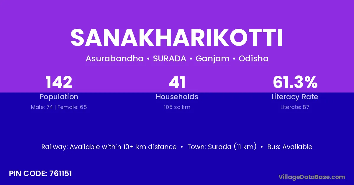 Sanakharikotti village has a total population of 142 people, of which 74 are males and 68 are females.