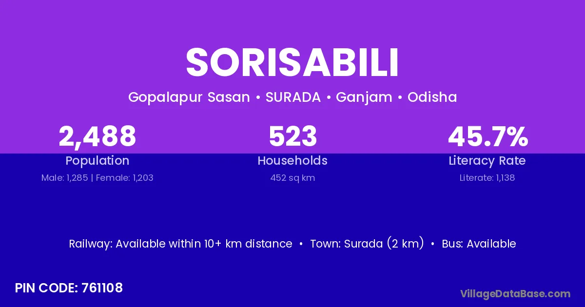 Surada (2 km) is the nearest town to Sorisabili village for major economic activities and is located approximately 2 km away.