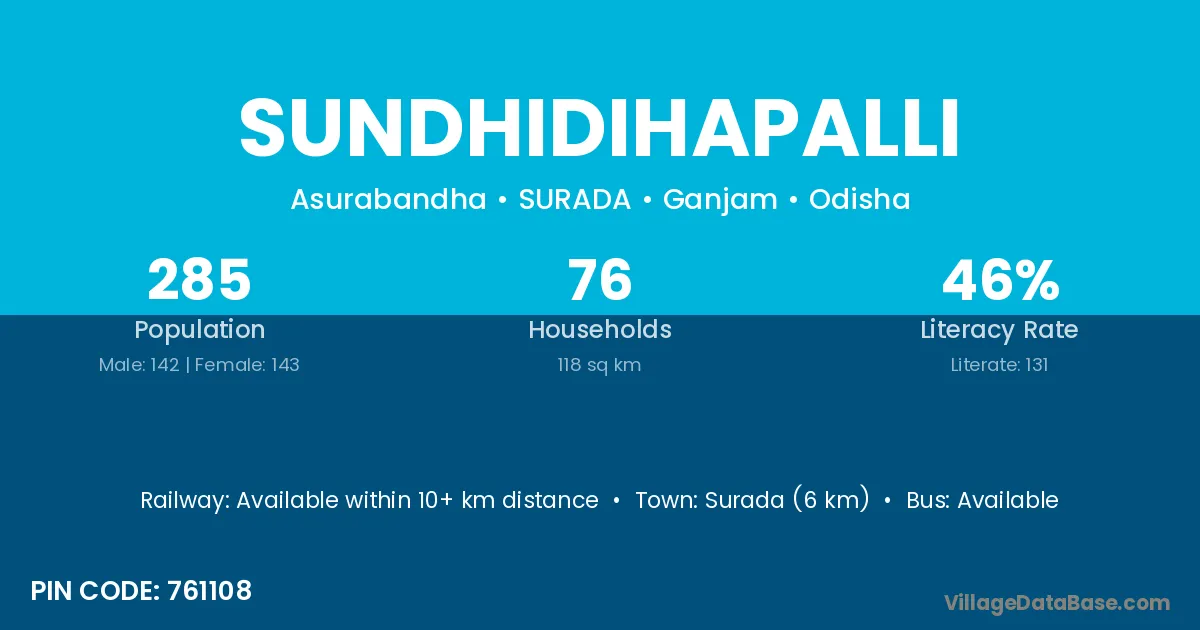 Surada (6 km) is the nearest town to Sundhidihapalli village for major economic activities and is located approximately 6 km away.