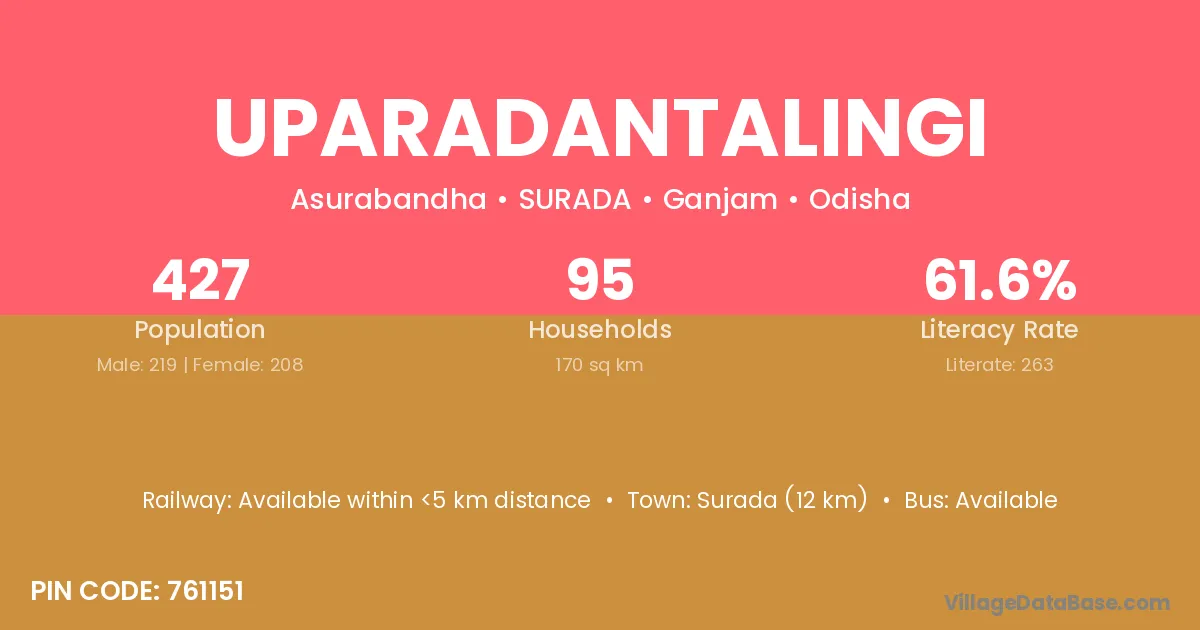 Surada (12 km) is the nearest town to Uparadantalingi village for major economic activities and is located approximately 12 km away.