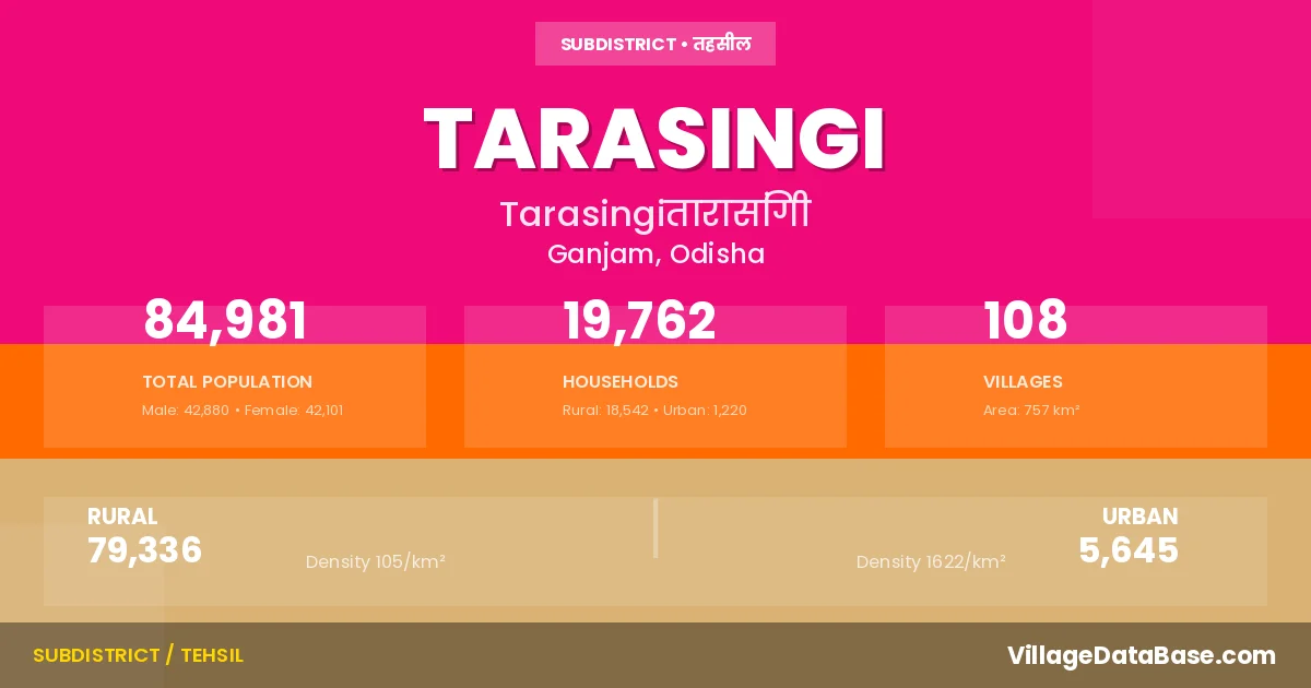 TARASINGI is a town and Tehsil in the Ganjam district of the Odisha. In India, a Tehsil is a subdivision of a district responsible for the administration and revenue collection of a specific area within the district. Tehsils play a crucial role in the local governance structure, contributing significantly to the development and administration of their communities.