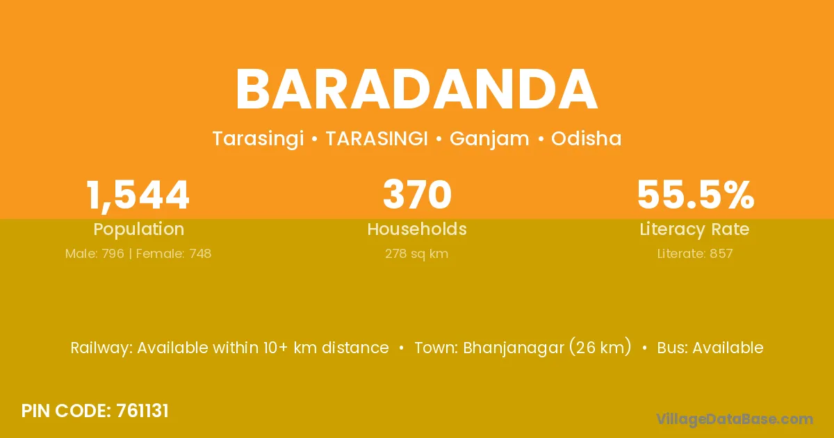 Bhanjanagar (26 km) is the nearest town to Baradanda village for major economic activities and is located approximately 26 km away.