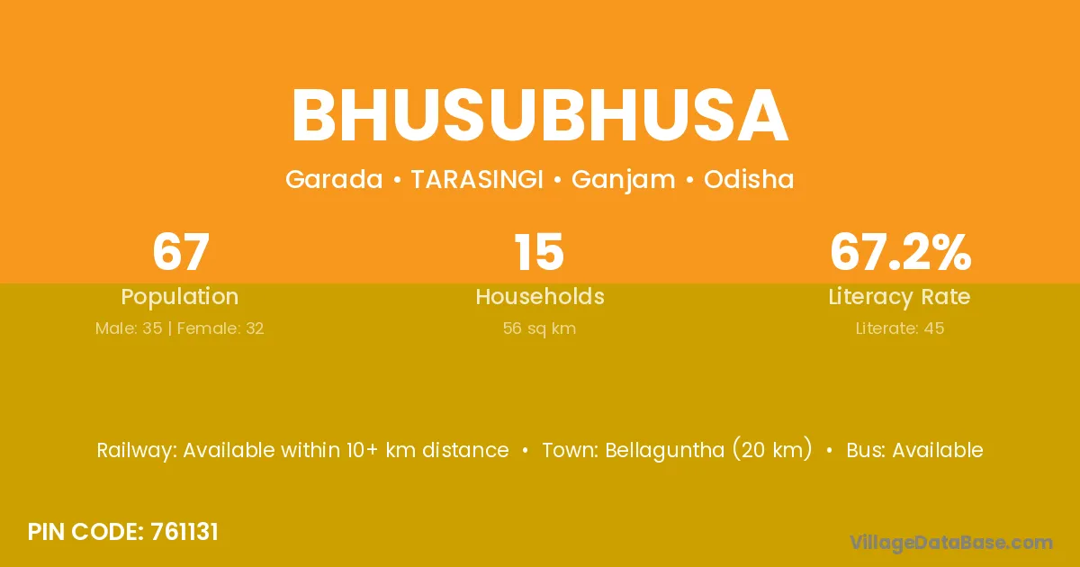Bhusubhusa village has a total population of 67 people, of which 35 are males and 32 are females.