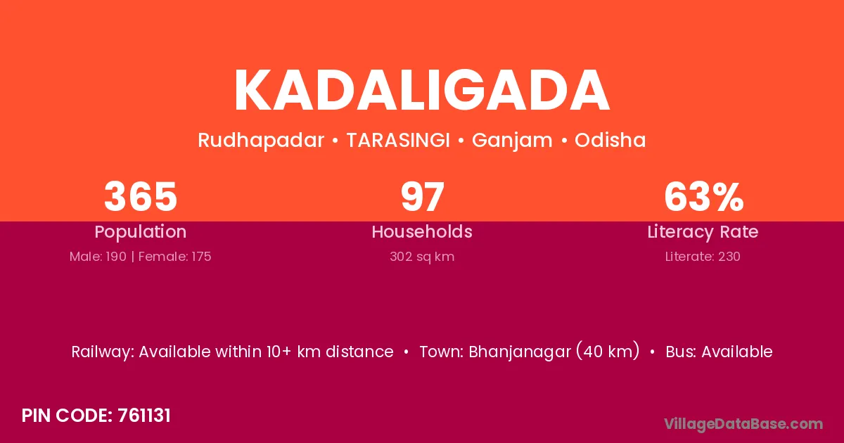 Bhanjanagar (40 km) is the nearest town to Kadaligada village for major economic activities and is located approximately 40 km away.