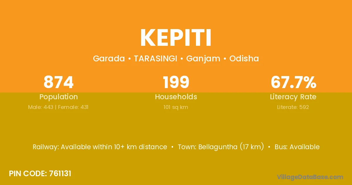 Bellaguntha (17 km) is the nearest town to Kepiti village for major economic activities and is located approximately 17 km away.
