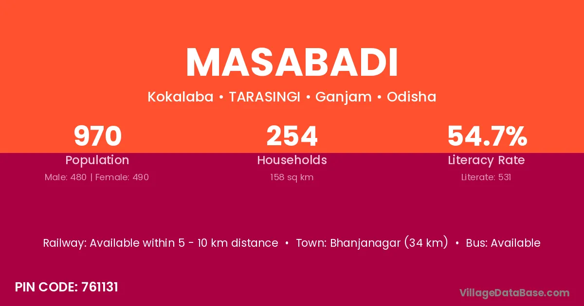Masabadi village has a total population of 970 people, of which 480 are males and 490 are females.