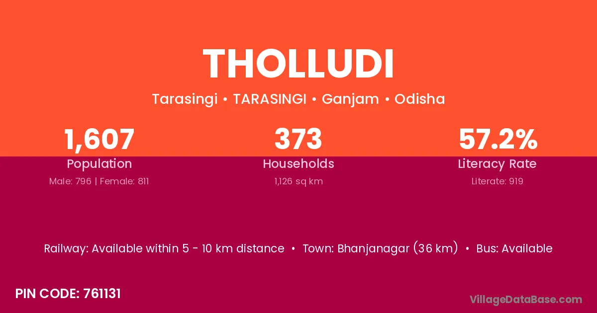 Bhanjanagar (36 km) is the nearest town to Tholludi village for major economic activities and is located approximately 36 km away.
