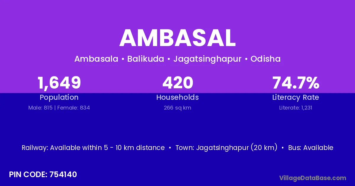 Jagatsinghapur (20 km) is the nearest town to Ambasal village for major economic activities and is located approximately 20 km away.