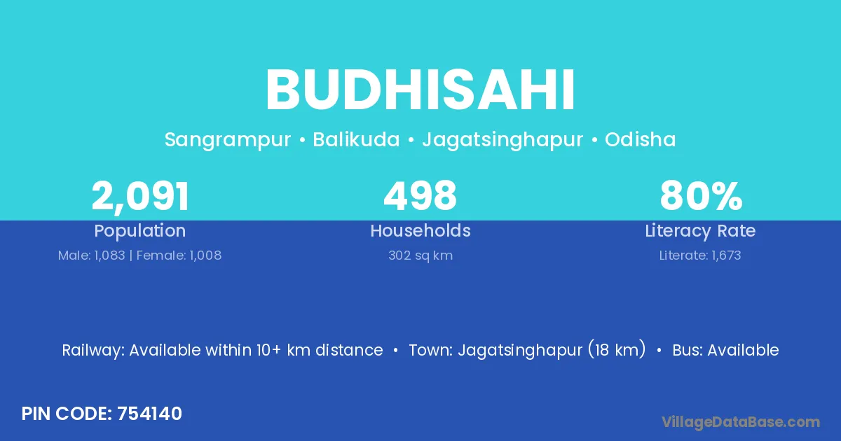 Jagatsinghapur (18 km) is the nearest town to Budhisahi village for major economic activities and is located approximately 18 km away.