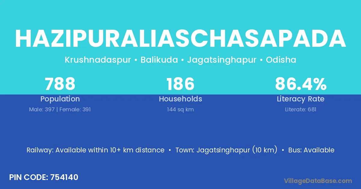 Hazipuraliaschasapada village has a total population of 788 people, of which 397 are males and 391 are females.