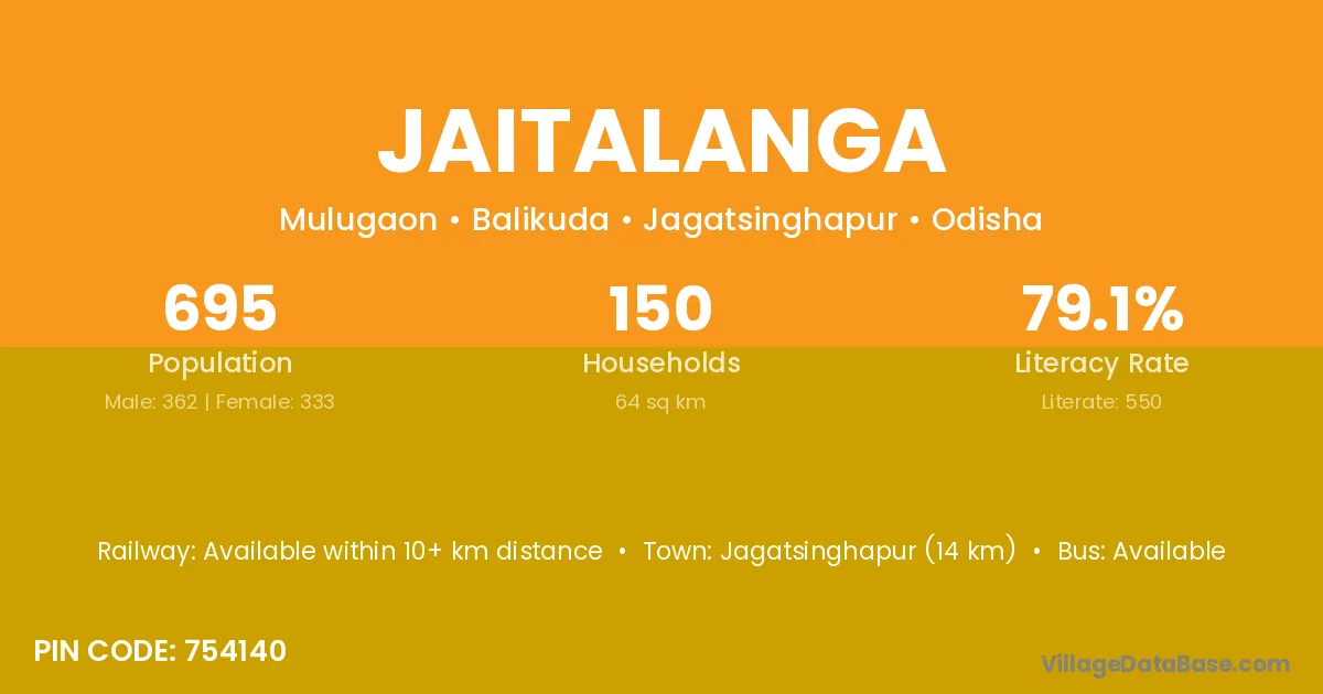 Jaitalanga village has a total population of 695 people, of which 362 are males and 333 are females.