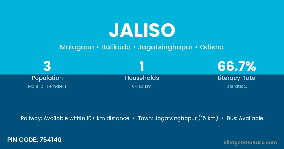 Jagatsinghapur (15 km) is the nearest town to Jaliso village for major economic activities and is located approximately 15 km away.