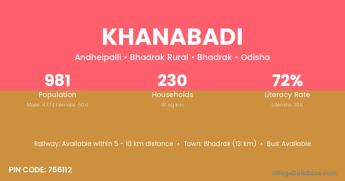 Jagatsinghapur (12 km) is the nearest town to Khanabadi village for major economic activities and is located approximately 12 km away.