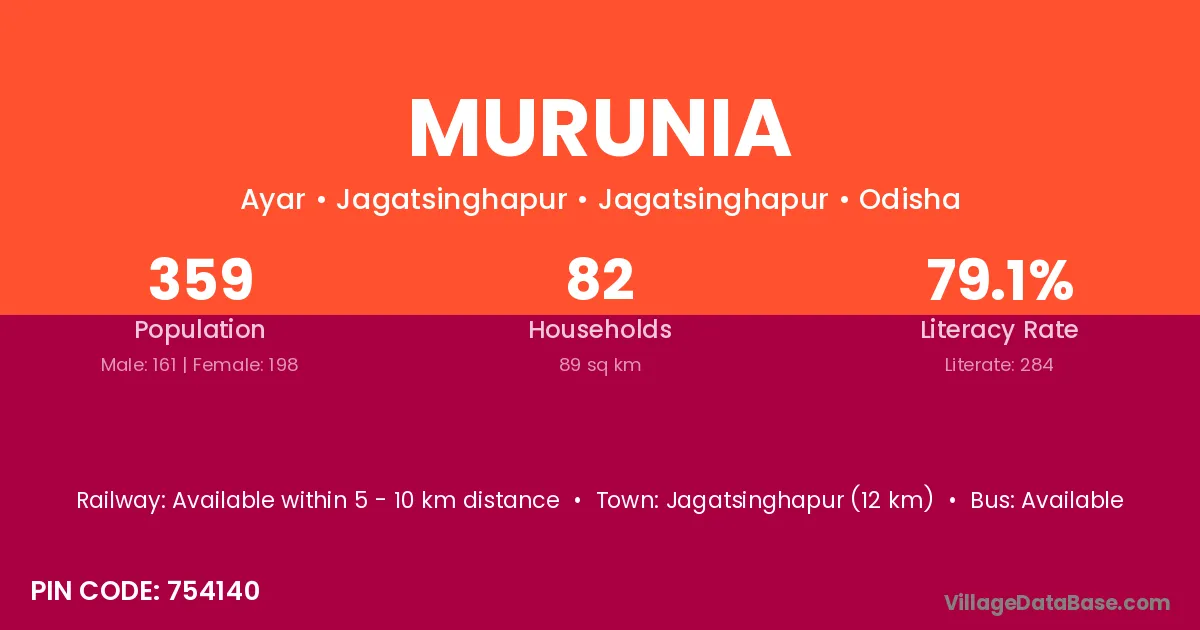 Jagatsinghapur (26 km) is the nearest town to Murunia village for major economic activities and is located approximately 26 km away.