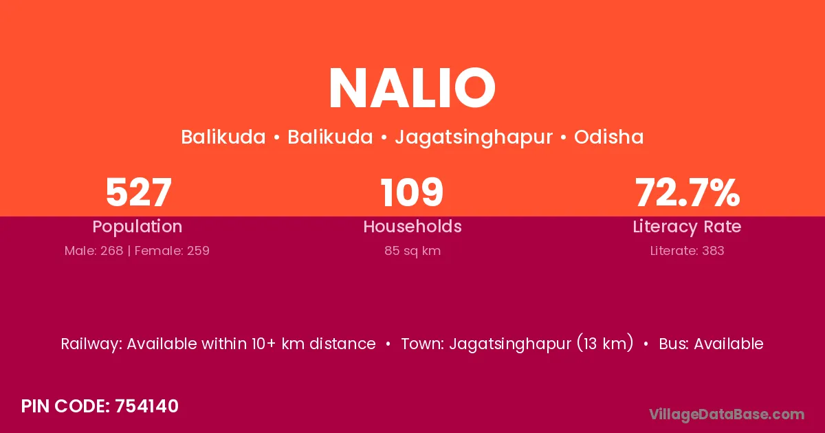 Jagatsinghapur (13 km) is the nearest town to Nalio village for major economic activities and is located approximately 13 km away.