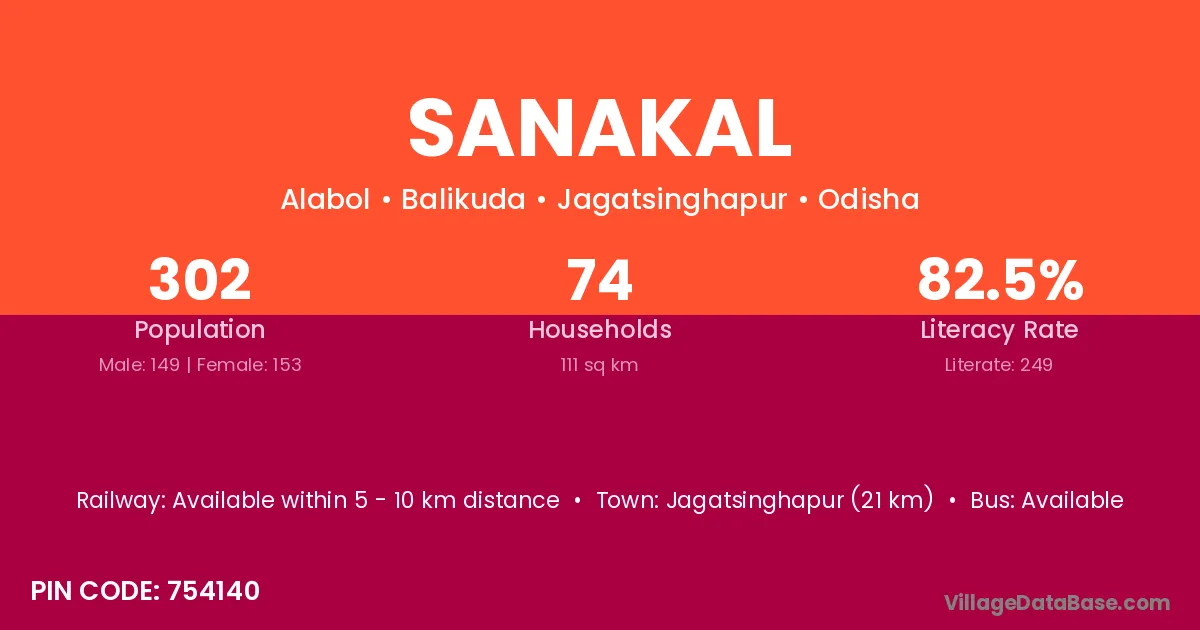 Jagatsinghapur (21 km) is the nearest town to Sanakal village for major economic activities and is located approximately 21 km away.