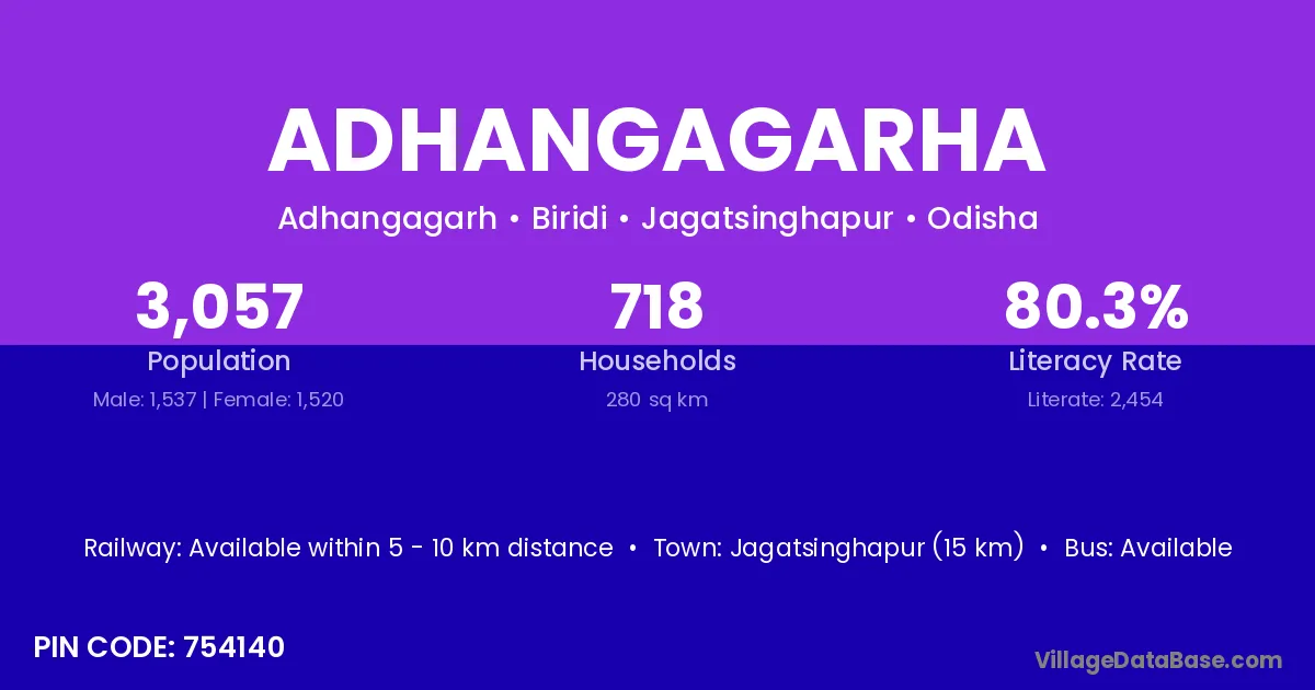 Jagatsinghapur (15 km) is the nearest town to Adhangagarha village for major economic activities and is located approximately 15 km away.