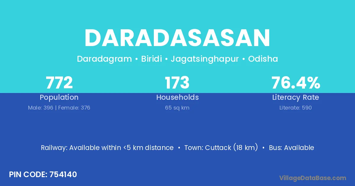 Cuttack (18 km) is the nearest town to Daradasasan village for major economic activities and is located approximately 18 km away.