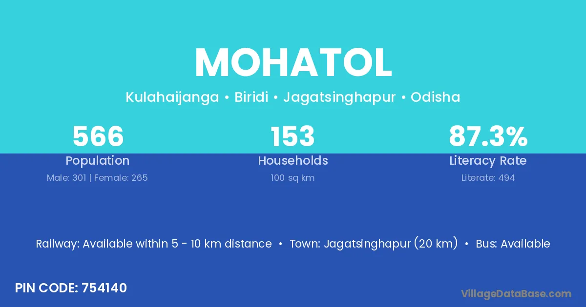 Jagatsinghapur (20 km) is the nearest town to Mohatol village for major economic activities and is located approximately 20 km away.