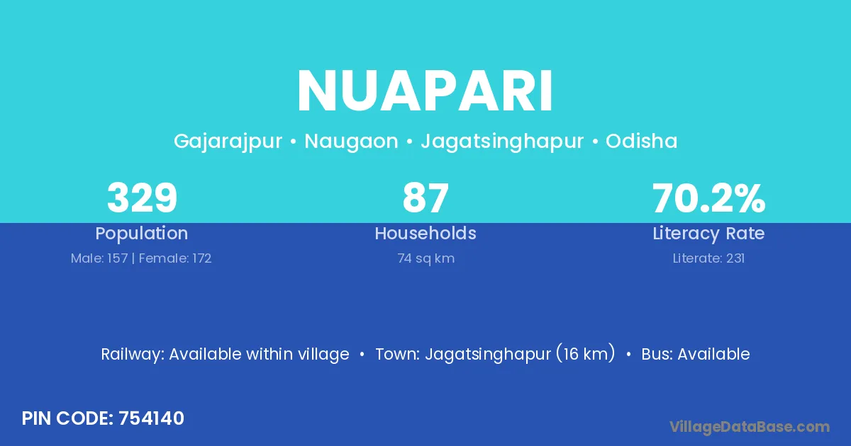 Jagatsinghapur (25 km) is the nearest town to Nuapari village for major economic activities and is located approximately 25 km away.