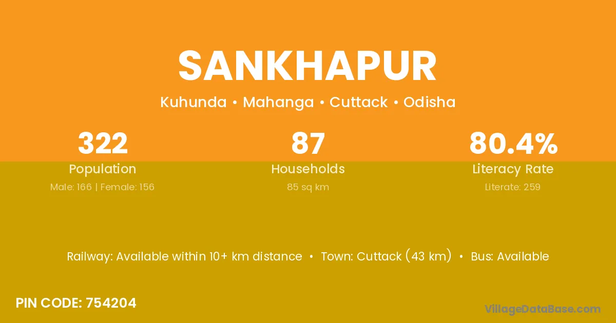 Cuttack (20 km) is the nearest town to Sankhapur village for major economic activities and is located approximately 20 km away.