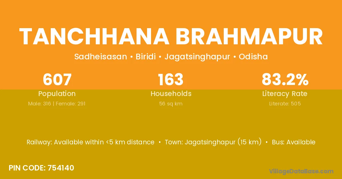 Jagatsinghapur (15 km) is the nearest town to Tanchhana Brahmapur village for major economic activities and is located approximately 15 km away.