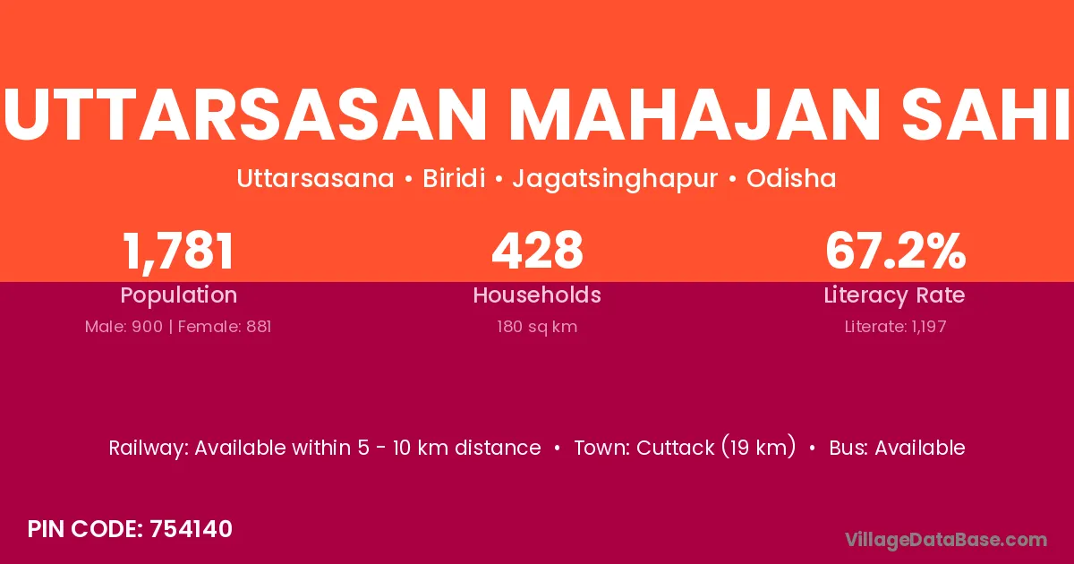 Cuttack (19 km) is the nearest town to Uttarsasan Mahajan Sahi village for major economic activities and is located approximately 19 km away.