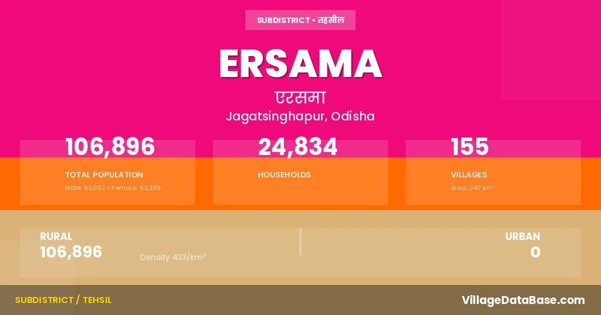 According to the 2011 census The total area of Ersama Tehsil is 247 km², with a population of 106896 people. The population density is 433 inhabitants per square kilometre, and there are approximately 24834 houses in the sub district.