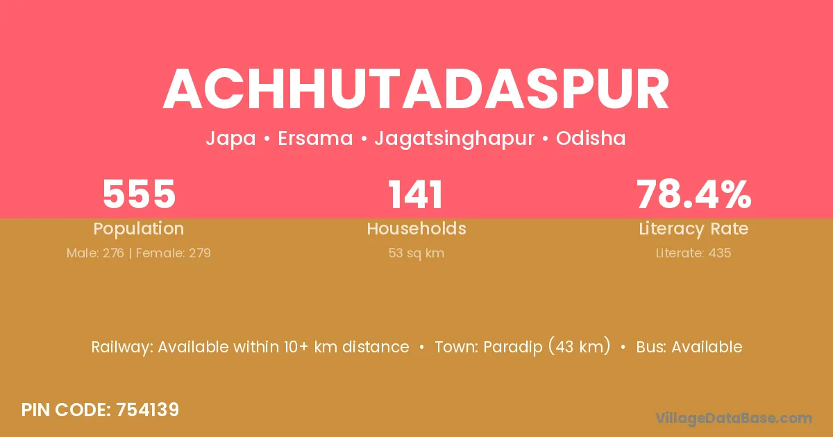 Paradip (43 km) is the nearest town to Achhutadaspur village for major economic activities and is located approximately 43 km away.