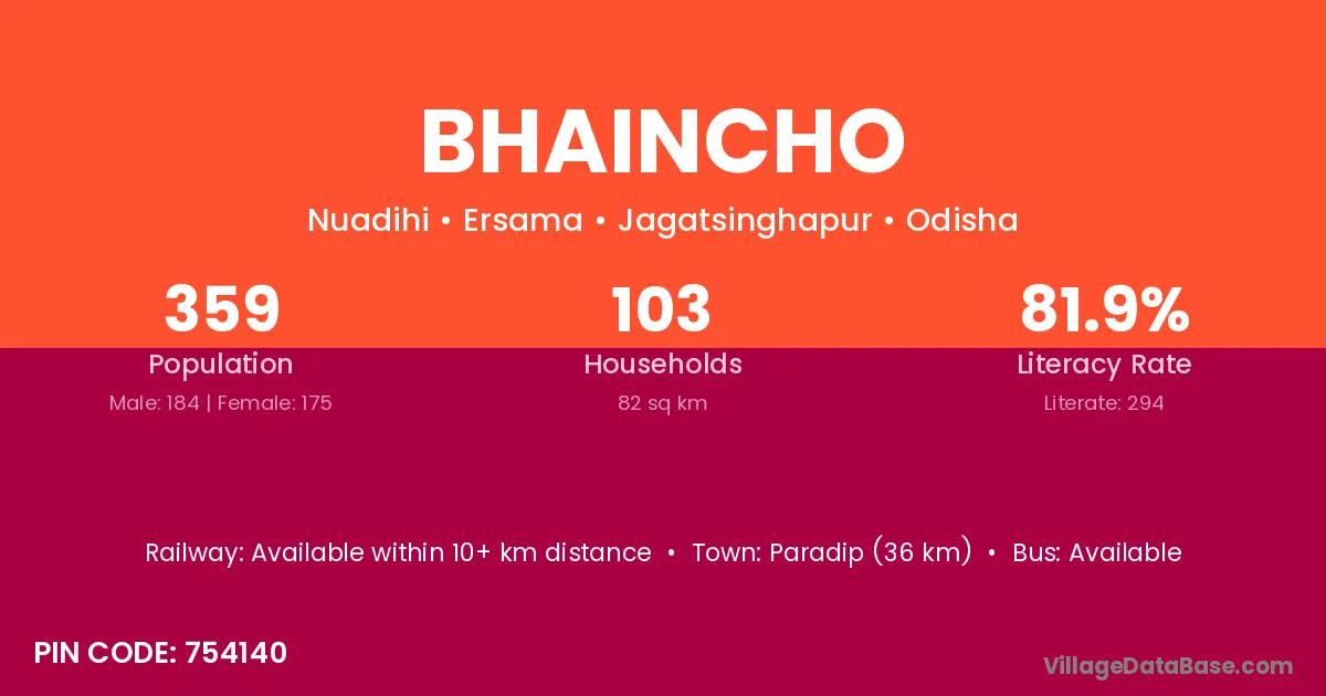 Paradip (36 km) is the nearest town to Bhaincho village for major economic activities and is located approximately 36 km away.