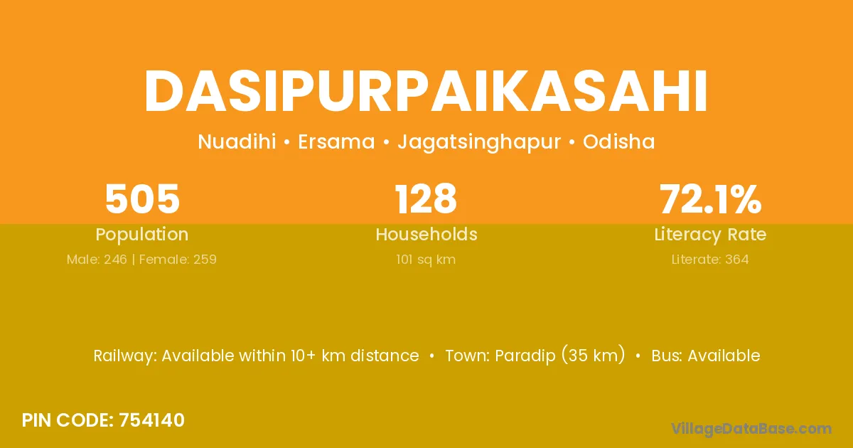 Paradip (35 km) is the nearest town to Dasipurpaikasahi village for major economic activities and is located approximately 35 km away.